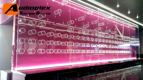 - Grawerowanie – subtelne wzory na powierzchni plexi dodają elegancji i wyróżniają bar na tle innych elementów wnętrza.