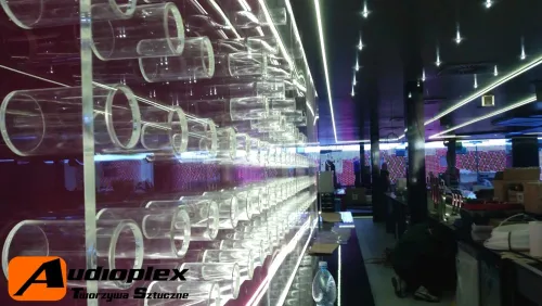 W projekcie wykorzystaliśmy również rury z plexi, które dodatkowo podkreślają nowoczesny charakter baru, nadając mu lekkości i unikalnego stylu.